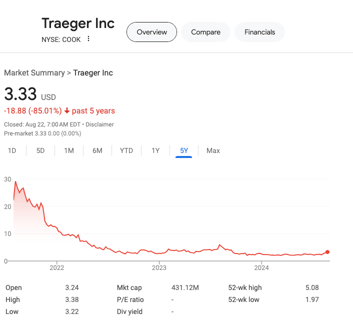 Traeger is fending off death after 3 straight years of unprofitable + declining sales. Traeger is a bit of a 1 trick pony in a temporarily declining market.