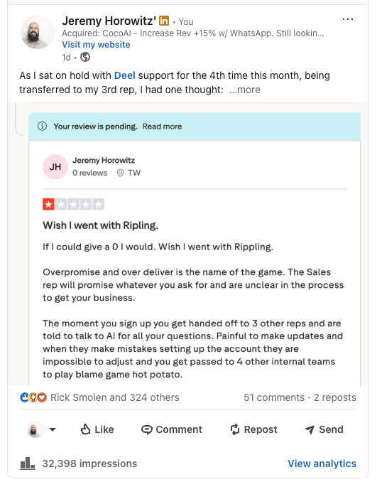 Last week, this post where I talked about my awful experience with Deel (We use for EOR for our European employees at Coco) went a little viral.