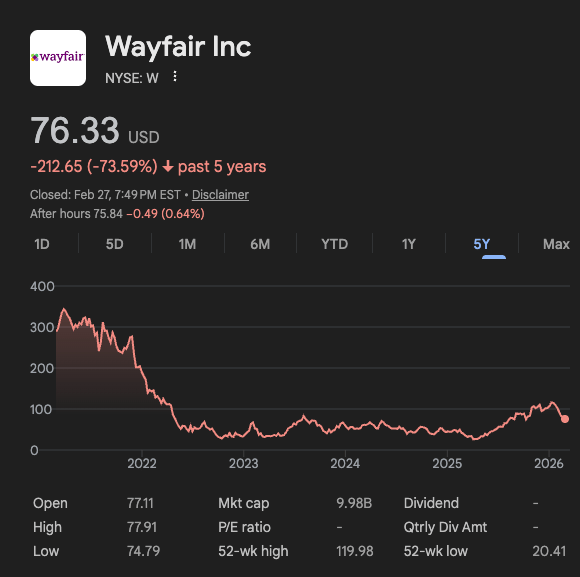 Wayfair's stock is down 45% in a year on a marketplace model Amazon dominates at 3x scale.
